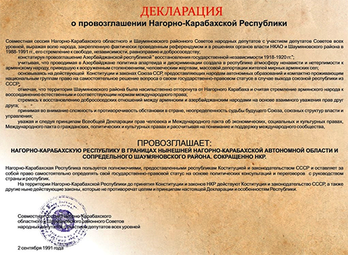 34 տարիներ առաջ՝ ճիշտ այս օրը, 1991թ. սեպտեմբերի 2-ին, ժողովրդական պատգամավորների Լեռնային Ղարաբաղի մարզային և Շահումյանի շրջանային խորհուրդների, բոլոր մակարդակների խորհուրդների պատգամավորների մասնակցությամբ համատեղ նստաշրջանը՝ արձանագրելով, որ Ադրբեջանը, դուրս գալով ԽՍՀՄ-ից, հռչակել է իր անկախությունը՝ վերականգնելով 1918-1920թթ. պետական անկախությունը և հիմնվելով «ԽՍՀՄ-ից միութենական հանրապետության դուրս գալու հետ կապված հարցերի լուծման կարգի մասին» ԽՍՀՄ 1990թ. ապրիլի 3-ի օրենքի վրա, մասնավորապես՝ 3-րդ հոդվածի վրա, որն ինքնավար կազմավորումների ժողովուրդներին իրավունք էր վերապահում ինքնուրույն որոշելու իրենց պետական-իրավական կարգավիճակը ԽՍՀՄ-ից միութենական հանրապետության դուրս գալու դեպքում, Լեռնային Ղարաբաղի Ինքնավար Մարզի և հարակից Շահումյանի շրջանի սահմաններում ընդունել է «Լեռնային Ղարաբաղի Հանրապետության հռչակման մասին» հռչակագիրը: